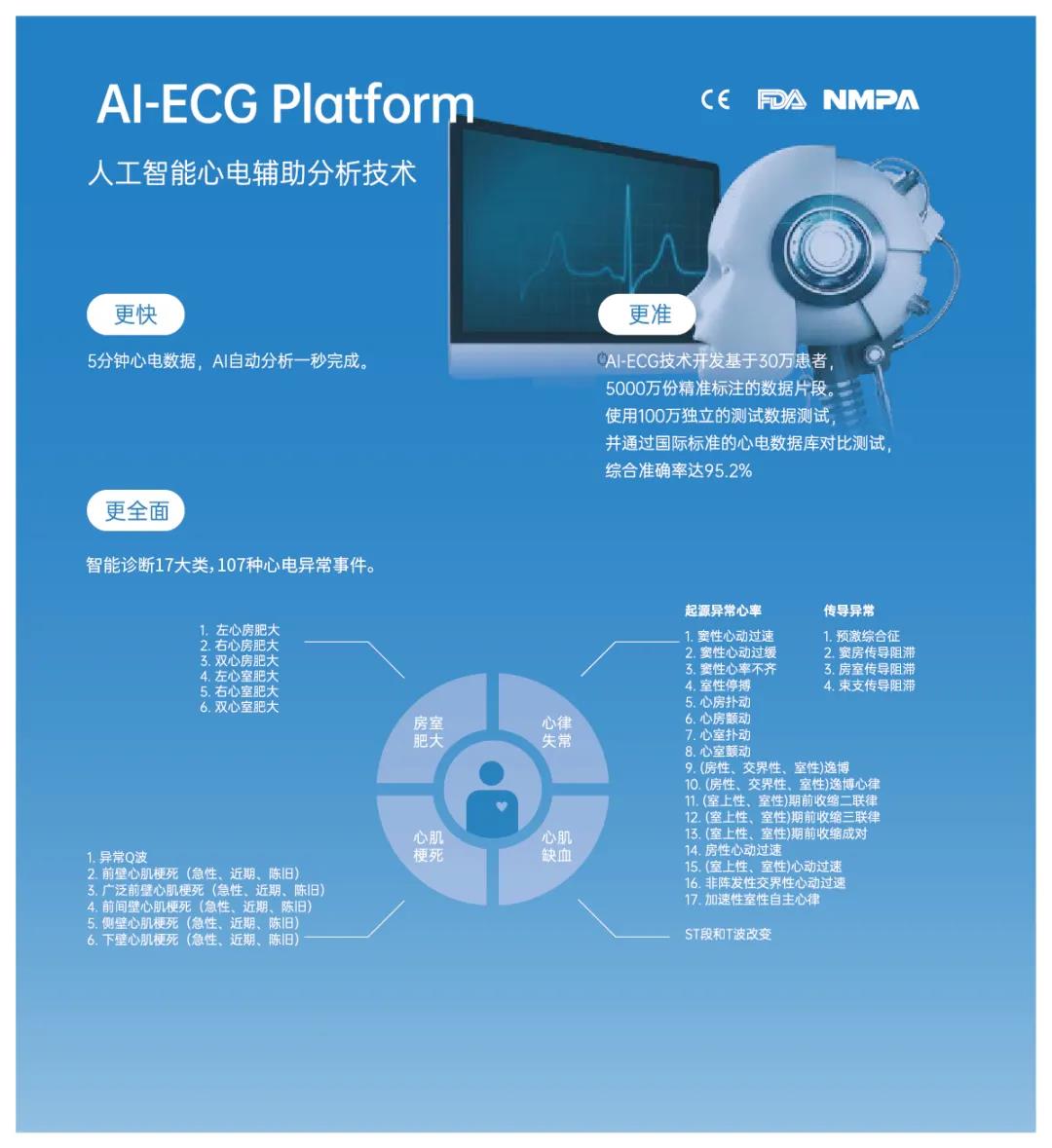 乐普AI移动医疗心电检测系列产品全面搭载乐普AI-ECGPlatform人工智能心电图诊断软件系统,通过先进人工智能算法,大幅提升心电诊断速度及准确率,5分钟心电数据,AI自动分析一秒完成,智能诊断17大类107种心电异常事件,综合准确率达95.2%,让用户足不出户即可享受智能专业的心电诊断,及时了解自身心脏健康状况。