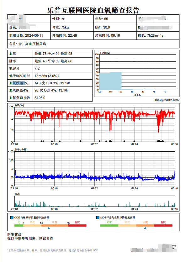 在下面的案例中,这位55岁女患者通过佩戴乐普戒指血氧仪O2Ring进行血氧检测和睡眠初筛,医生初步判断她可能患有中度呼吸阻塞。