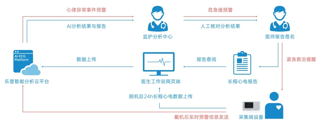 此次患者的成功救治离不开乐普心安宝的实时监护预警,通过乐普远程动态心电记录仪,对患者实现7*24小时全天候不间断监测,及时捕捉患者心电异常变化数据,并实时传输至心脏数据监护中心,由专业医生团队远程监护预警,从而及时发现患者异常情况,并及早做出干预有效降低患者的死亡率。
