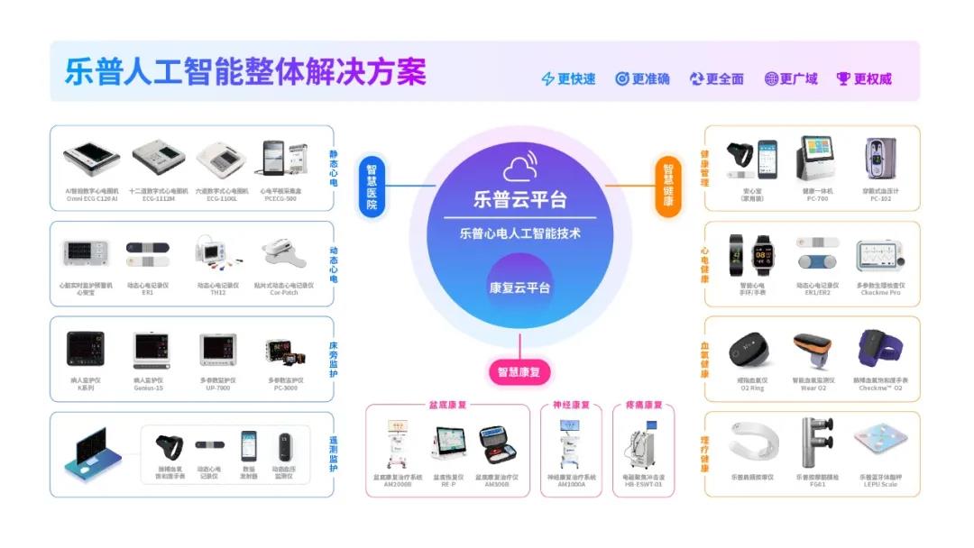 乐普云智在本次展会上展示了乐普云智的人工智能整体解决方案,以人工智能技术为依托,将智慧城市、智慧医院、智慧家庭作为三大应用场景,提供院内外心电监护、康复医疗的解决方案。